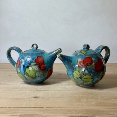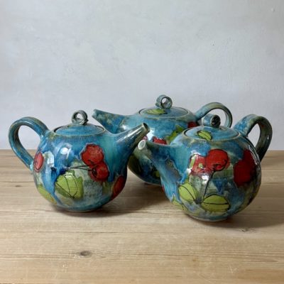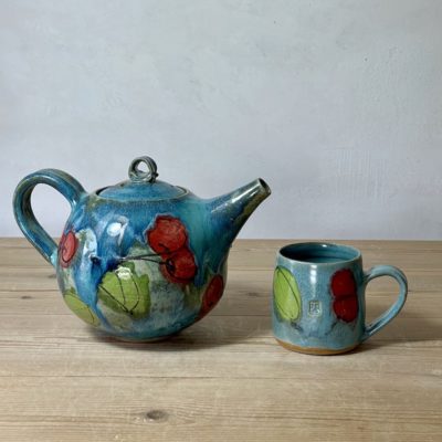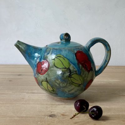 Each teapot is made individually and glazed inside with cloud grey and outside with hand painted cherry and leaf decoration on fabulous teal glaze