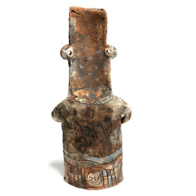 Made from amalgamated earthenware and terracotta clays and decorated with incised markings and coloured with oxides.