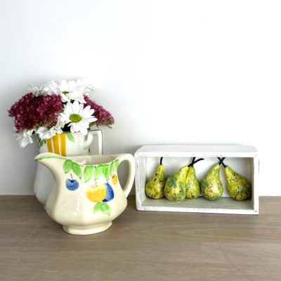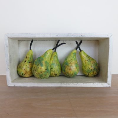 This little handmade box with a distressed chalky white finish, has little ceramic conference pears permanently fixed in place. Each clay pear has been handmade, ‘pinched’ into the form, with coloured slips and glazes applied in a painterly manner. The box has a hanging attachment on the back for wall display