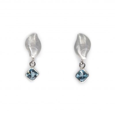 Annie’s designs are influenced by shapes and structures found in marine life and geological patterns. These silver earrings were inspired by pebble shapes found on St Abbs beach in Scotland and the embossed patterned surface emulates the water lapping over the rocks and pebbles. Each earring is hand textured so no two pairs are the same. The faceted blue topaz replicates the glistening sunlight on the water and compliments the pebble shape.
