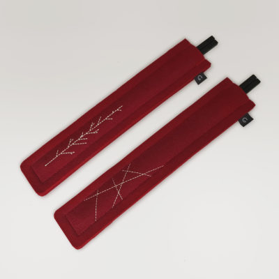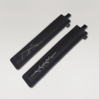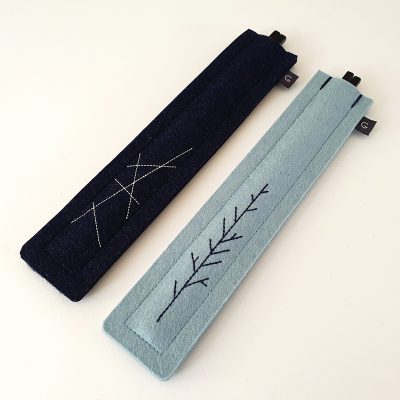 Felt makes an ideal case for keeping chopsticks in for travelling. It holds them together, snug enough that they do not fall out while on the move. The embroidered front has an abstract line pattern, inspired by cracked ice or a tree, with a Mid Century modern feel.