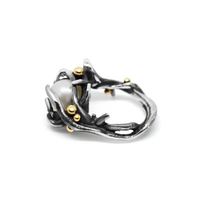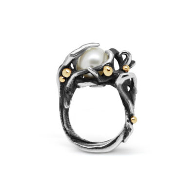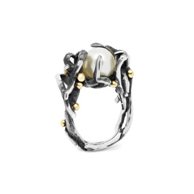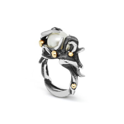 Inspired by the flora inhabiting the depths of the oceans, embracing a large creamy white fresh water pearl, the Abyss ring is crafted out of 925 sterling silver left in its raw form and adorned with subtle 9 ct yellow gold bead.
