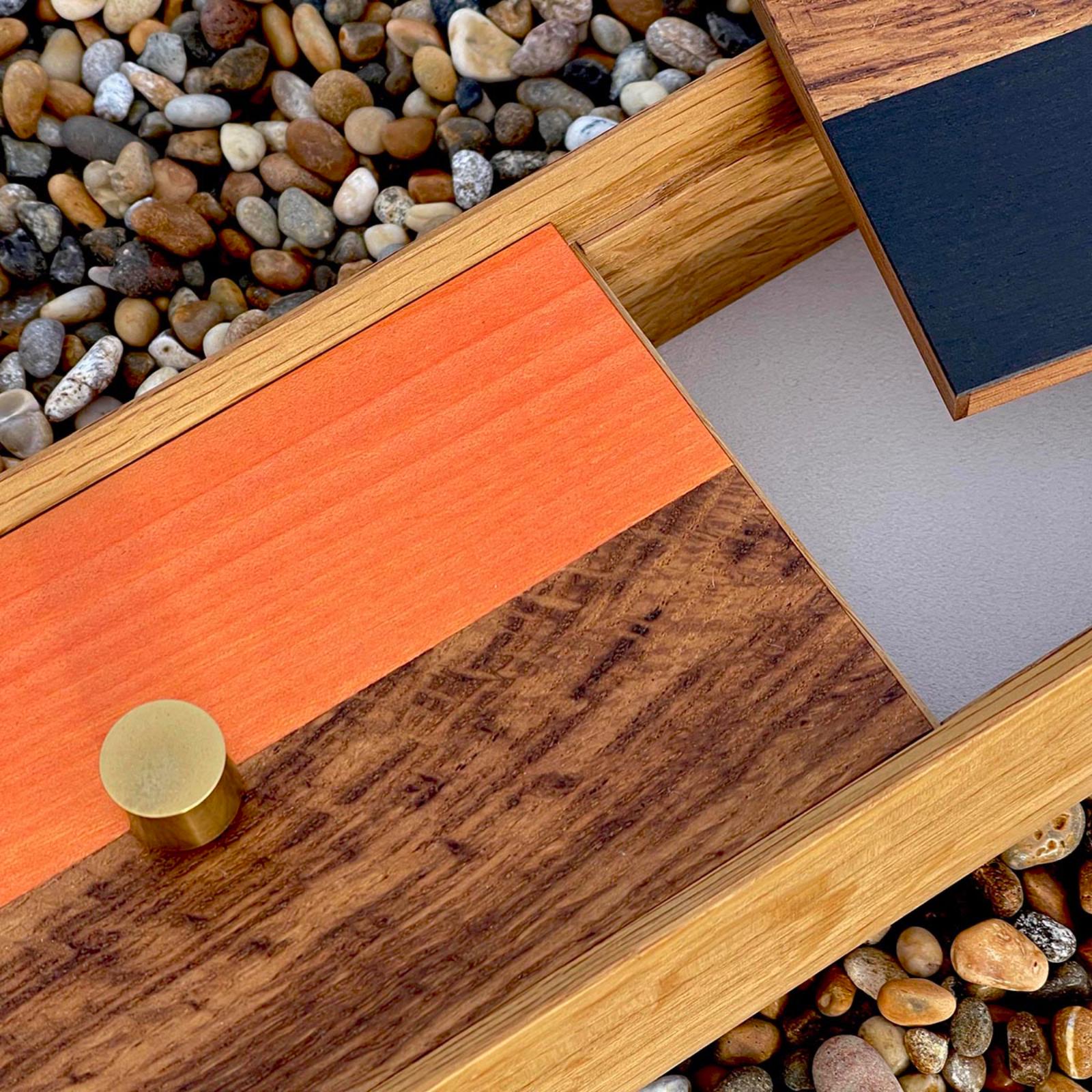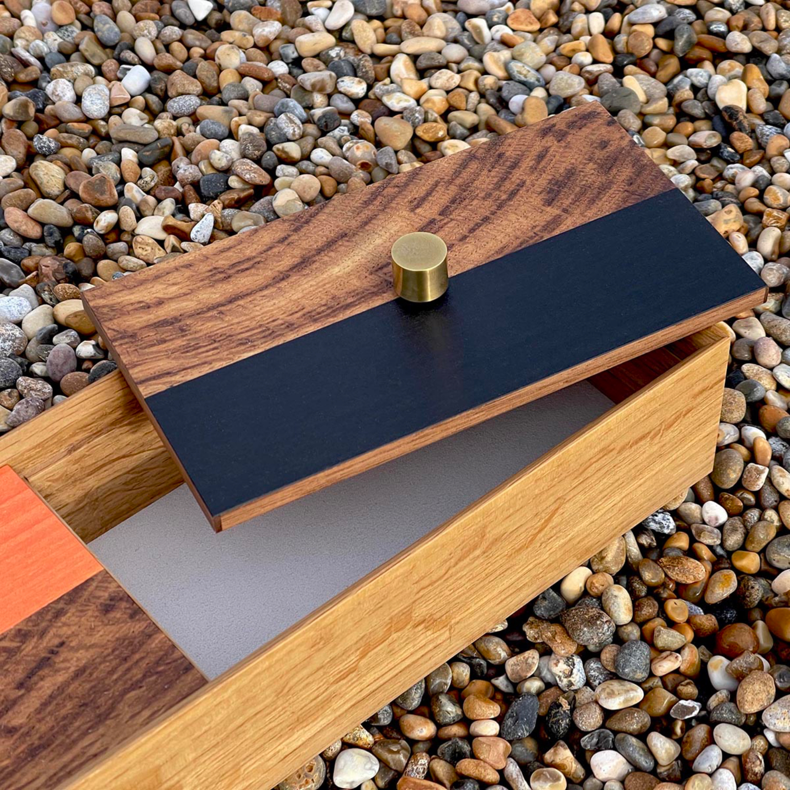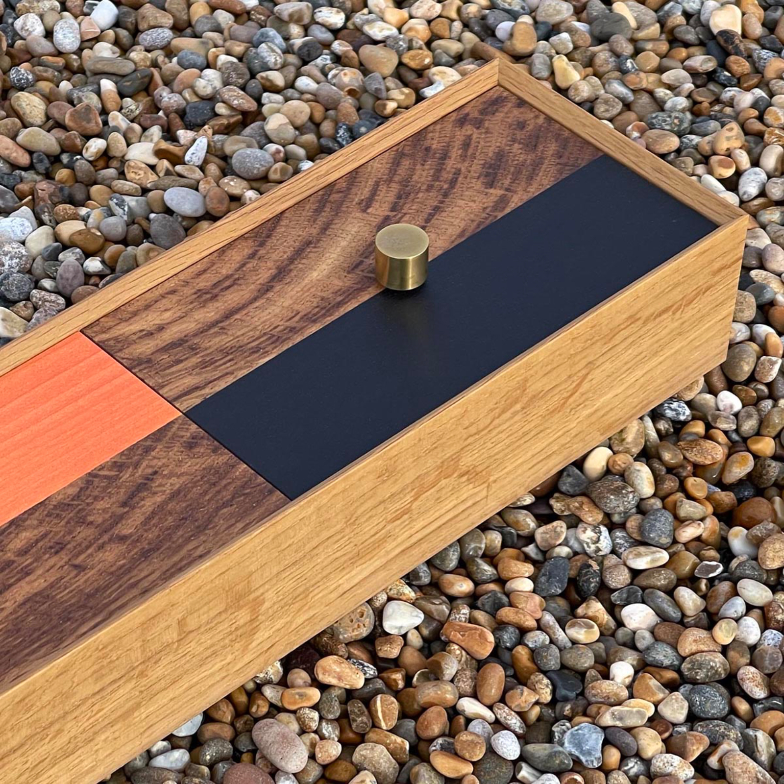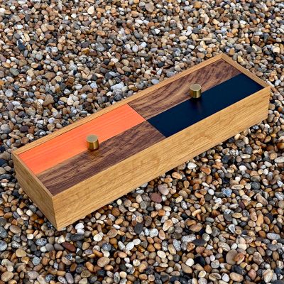 The two lids feature sections of tiger (brown) oak veneer and coloured tulipwood veneer and the handles are machined from solid brass.