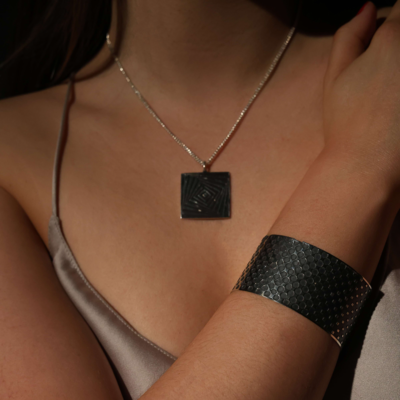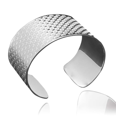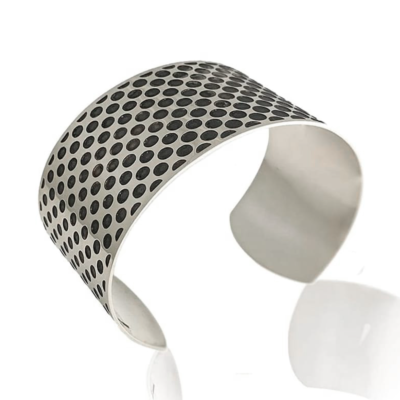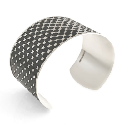 This cuff is handcrafted in Sterling Silver with a gradient optical effect; when rotating the cuff left to right you’ll see the dots details converting from positive to negative,