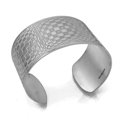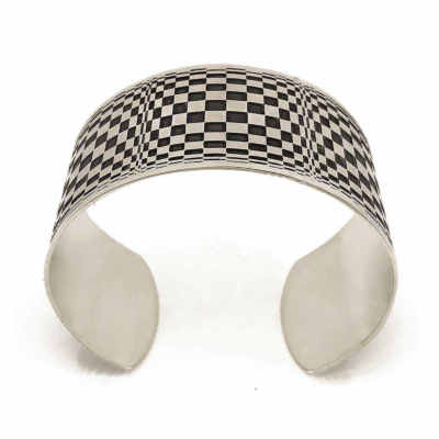 Handmade Cuff in solid sterling silver, the cuff is 35 mm wide making a bold accessory for your night out or special event. Inspired by OpArt, a movement that aim to create an optical effect through interpolating geometrical design. A unique piece of jewellery to wear with confidence.