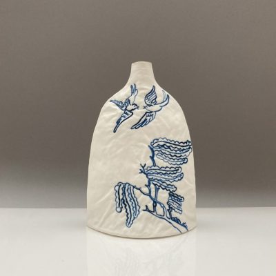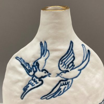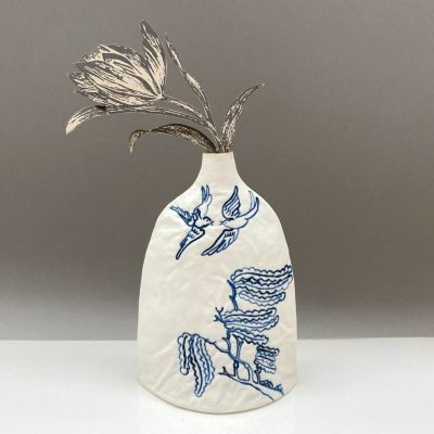 This blue and white porcelain vase, with its gold lustred rim, looks delightful either on its own or with a single stem from the garden. Two embroidered texture doves and willow tree, inspired by the willow pattern story are depicted. The stitches have been overpainted with cobalt to give a rich blue. The vase is made from slabs of porcelain that have been pressed into a plaster cast of my machine embroidered textile and cut and joined into shape. The vase is 21cm tall and the base is 14.5cm wide and 9cm deep. The interior has a glossy, transparent glaze and the rim has real gold lustre.
