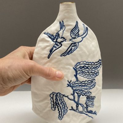 I make a range of simple shaped but highly textured, porcelain that combine my love of clay and textiles with wit and curiosity. They involve many processes from stitching patchwork, embroidering and upholstering textiles, making plaster casts of the textures and designing paper pattern templates to construct textured porcelain slabs into vessels designed to be used.