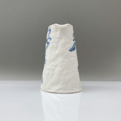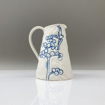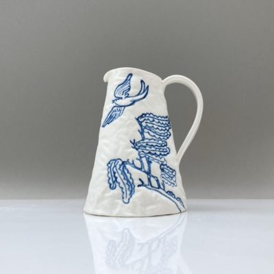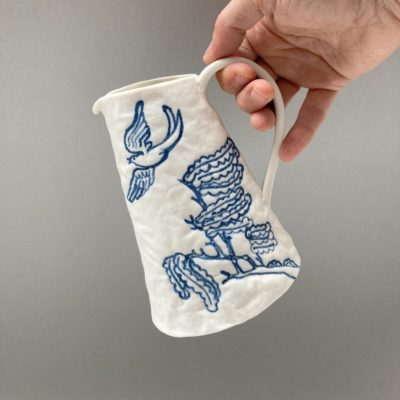 This functional porcelain jug has an embroidered textile texture showing key elements of the willow pattern story. I machine embroidered the willow tree, birds and orange tree, made a plaster cast of them and used this to pressmould and handbuild the jug. Once the jug was bisque fired, I overpainted the stitches with cobalt and fired again to give a rich blue. The interior and handle have a glossy transparent glaze and the exterior is matt. There are three sprigged buttons on the base.